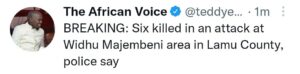 But they seems to be back again as this morning reports have it that hat there was a terror attack in Lamu County which has left six people dead on the spot.