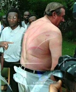 Dr. Richard Leakey showing some whip marks inflicted by KANU youths back in 1995 at Nakuru Law Courts.