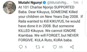 “If Raila wanted to kill Kikuyus, he would have done it in 2008. But someone killed Kikuyus, kula Ruto, Kura Raila”, Ngunyi has stated through his twitter account.