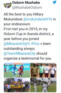 “l first met you in 2015, in my Osborn Cup in Ibanda district, a year before you joined Mbarara City FC, You have been outstanding always. Mbarara City FC should organize a testimonial for you,” he added