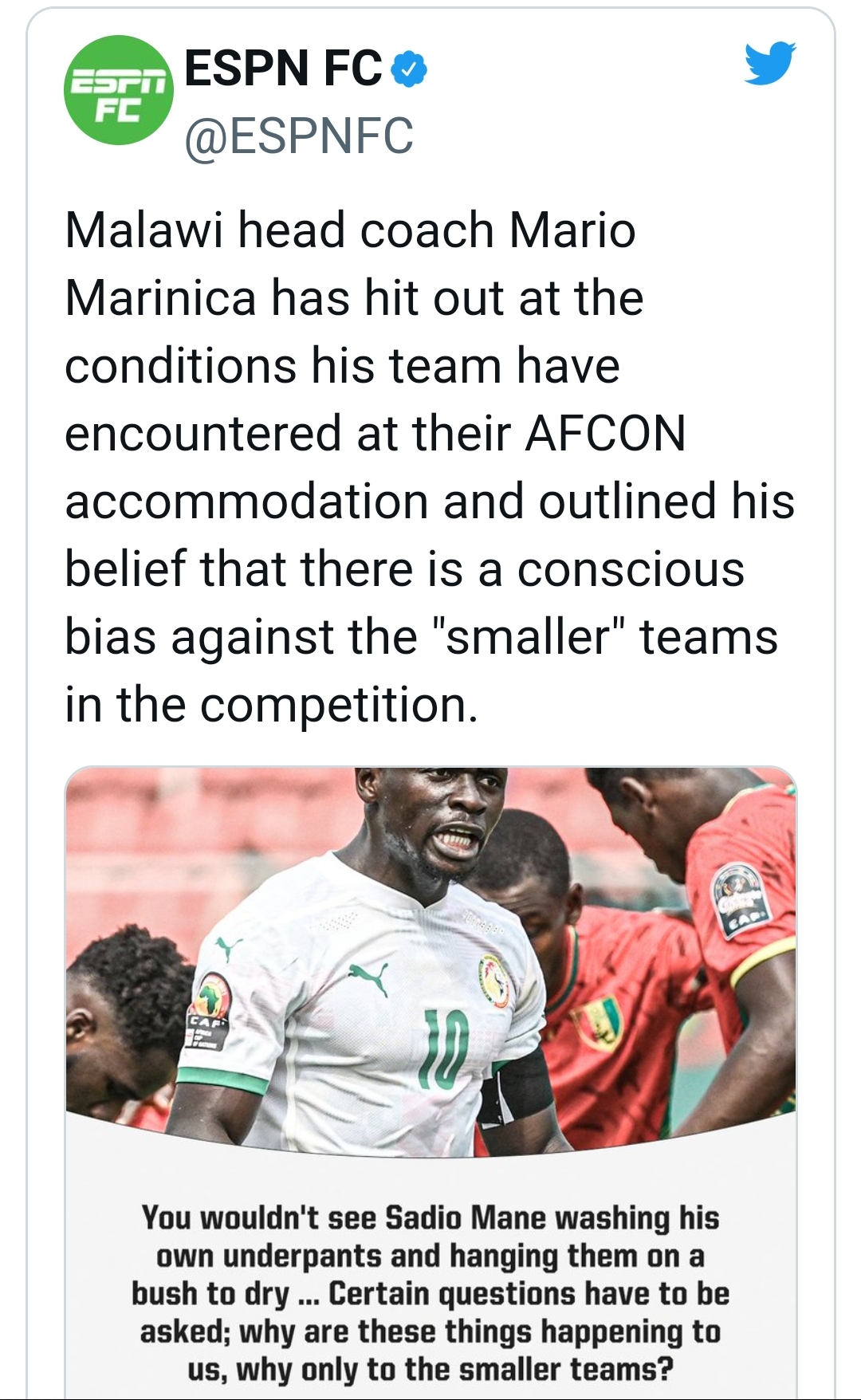 You wouldn’t see Sadio Mane washing his own underpants and hanging them on a bush to dry. There are different standards here, teams are being treated differently,” Marinica divulged to ESPN. “We talk about inclusion, we want to have minnows, small teams doing fantastic things, but when it comes to the latter stages, people don’t fancy us playing against Cape Verde and not Senegal playing Morocco [for example]. “Certain questions have to be asked; why are these things happening to us, why only to the smaller teams, why only to Comoros, Gambia, us?” He posed