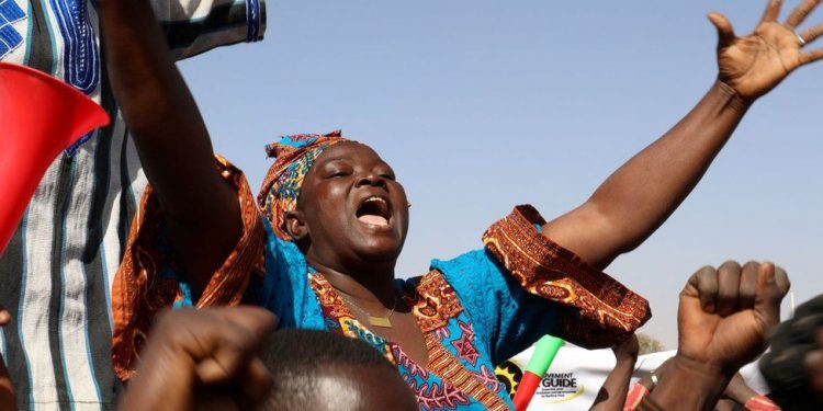 People gather in support of a coup that ousted President Roch Kabore, dissolved government, suspended the constitution and closed borders in Burkina Faso, Ouagadougou January 25, 2022.