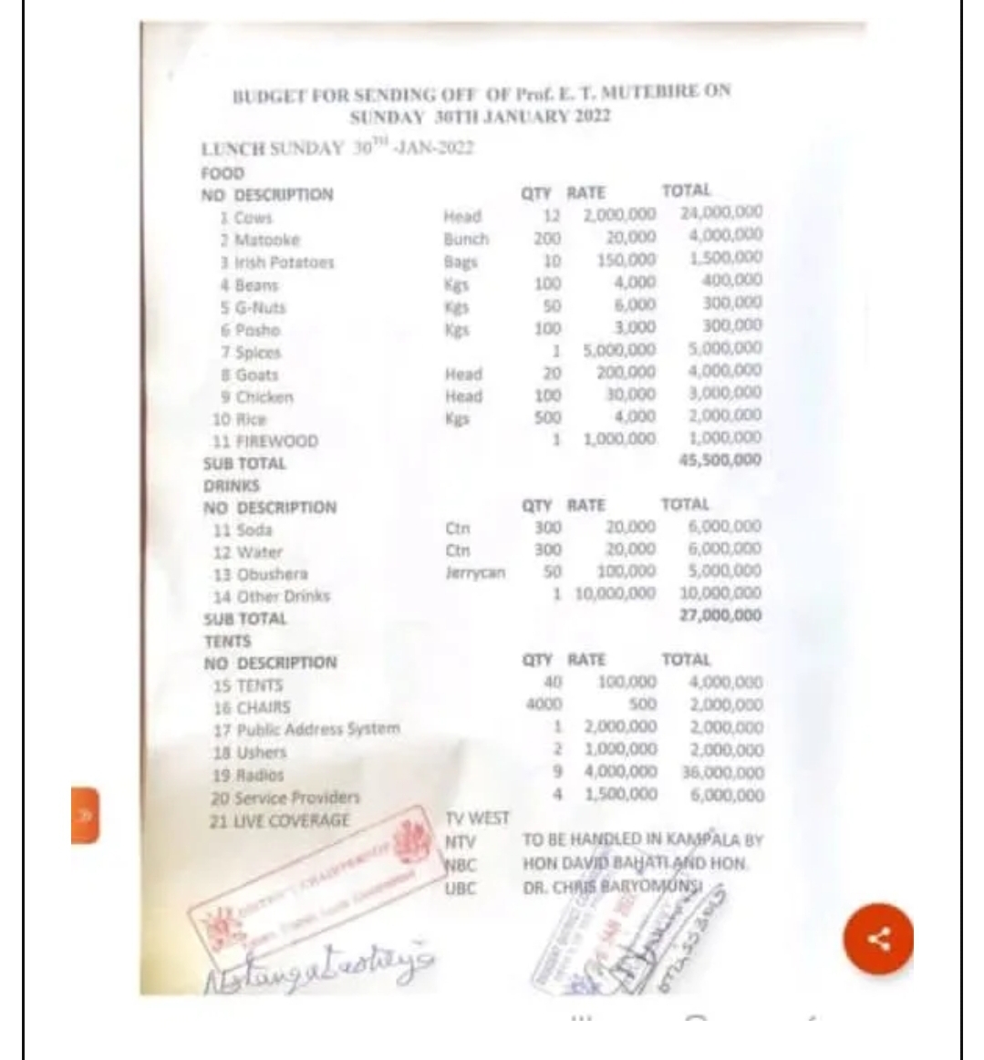 The Nile Post article written 27th January, 2022 reveals how food and drinks at the burial are projected to cost Ugx244m; Ugx6m to be spent of 300 cartons of water, Ugx6m on soda, and Ugx5m on Obushera.