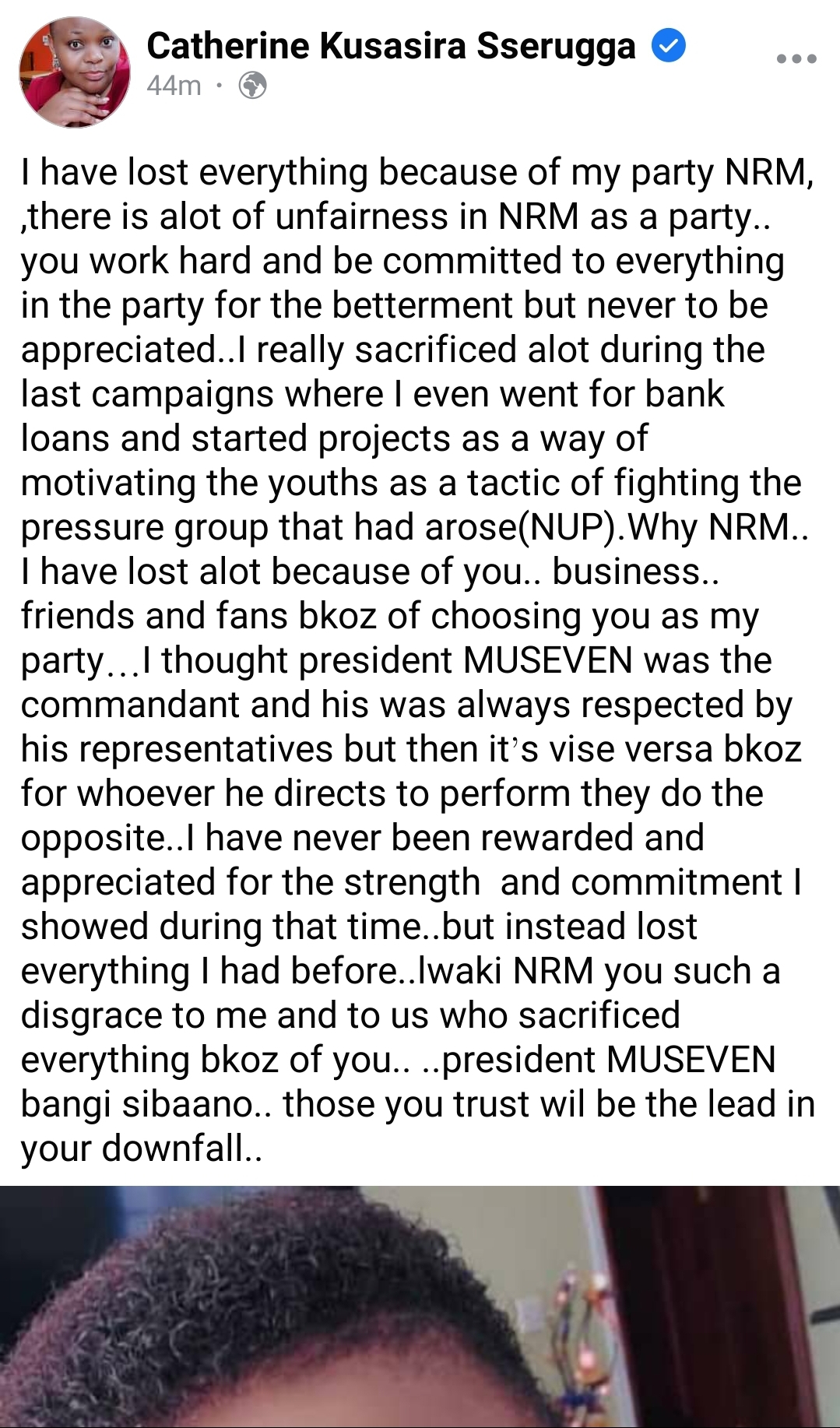 I have lost everything because of my party NRM,,there is alot of unfairness in NRM as a party..you work hard and be committed to everything in the party for the betterment but never to be appreciated..I really sacrificed alot during the last campaigns where I even went for bank loans and started projects as a way of motivating the youths as a tactic of fighting the pressure group that had arose(NUP).Why NRM..I have lost alot because of you.. business..friends and fans bkoz of choosing you as my party…I thought president MUSEVEN was the commandant and his was always respected by his representatives but then it’s vise versa bkoz for whoever he directs to perform they do the opposite..I have never been rewarded and appreciated for the strength and commitment I showed during that time..but instead lost everything I had before..lwaki NRM you such a disgrace to me and to us who sacrificed everything bkoz of you.. ..president MUSEVEN bangi sibaano.. those you trust wil be the lead in your downfall..