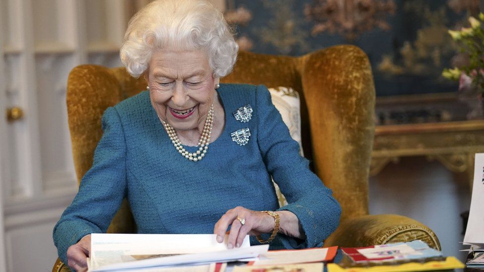 The Queen, wearing jewellery given to her by her father, King George VI, was shown well-wishers’ jubilee cards