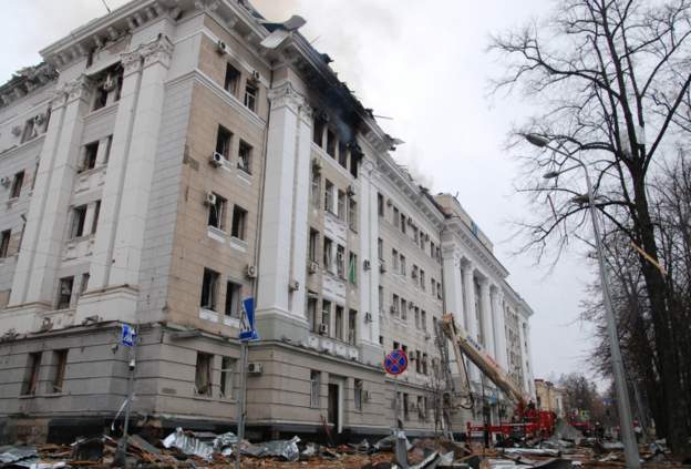 A missile struck the regional police department in Kharkiv at around 08:10 local time