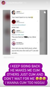 The former socialite did not talk about love being the reason she returns to her man, but rather – satisfaction, as evidenced in stories uploaded on her Instagram page this past weekend.