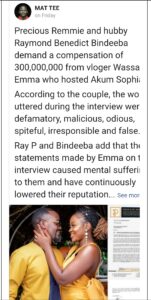 The couple are dragging Wasswa Emma to courts of law with claims that the story he published on his channel is untrue and baseless.