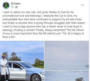 ” I want to debut my new ride and gives thanks to God for his unconditional love and blessings. I dedicate this Car to God, my undoubtable fans who have continued to support my art and music and finally to anyone who is going through struggles with their dream. ” Part of his statement reads.