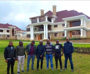 Businessman Sam Mburu (center) and friends posing in front of his house ahead of Susan Kihika’s swearing in.