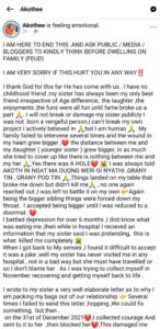 “I thank God for this far He has come with us . I have no childhood friend ,my sister has always been my only best friend irrespective of Age difference, the laughter ,the enjoyments ,the funs were all fun until fame broke us a part 🙏. I will not break or damage my sister publicly I was not born a vengeful person,I can’t break my own project I actively believed in 🙏but I am human 🙏. My family failed to intervene several times and the wound in my heart grew bigger.” Read part of her post.