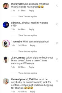 Diana Marua was seen calling Kibe poor and asking why he had it out for her on her Instagram stories.