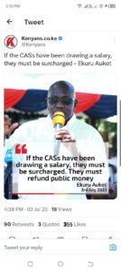 The Kenyan court recently ruled that the appointments of certain CASs were illegal. Aukot is demanding that these CASs return their salaries, per diem, and other benefits accrued during their illegal tenure.