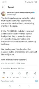 Nandi Senator Samson Cherargei has criticized the High Court of Kenya for ruling that the president’s move to appoint Chief Administrative Secretaries (CASs) was unconstitutional.