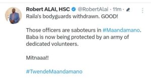 Guards have left Raila alone. GOOD! Those policemen in Maandamano are saboteurs. To safeguard Baba, Hon. Robert Alai claims, “an army of dedicated volunteers” is on the job.