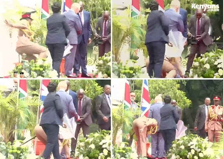 “Ni Njaa” Reactions As Soldier trips and falls at State House during King Charles III historic visit