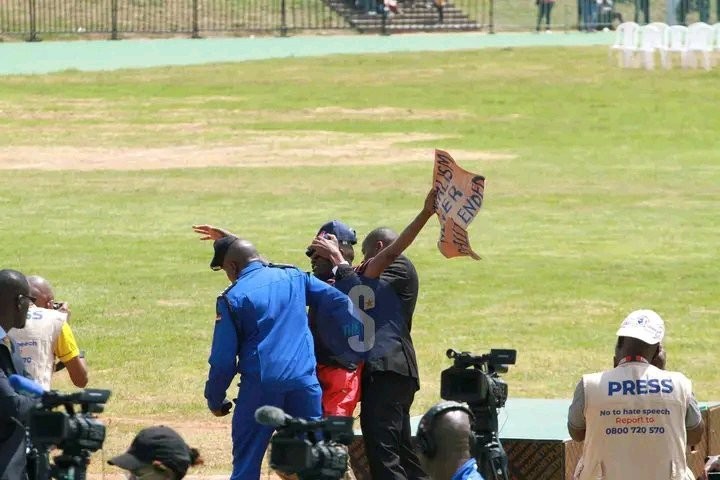 Captured in circulating online photos, security officers swiftly handled Julius Kamau, who attempted to disrupt the presidential address.