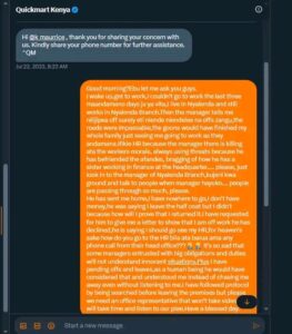 “Good evening Nyakundi. About Quickmart I worked at Nyalenda branch in Kisumu. There was a manager named Kariuki who was mistreating wafanyikazi badly especially ladies. Usipopeana kasusu hauna lako. He has gotten many people fired. The problem with Quickmart is the management of outsourcing agents. The outsourcing management huwa hawataki kusikiza kesi imeletwa na their bosses ‘Quickmart’. When I was at Nyalenda they even tried bringing an outsourced regional supervisor but when they arrived they turned against the employees because hawataki kumwaga unga. Here is my complaint about them during my time in Nyalenda.”