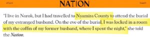 What should have been a solemn farewell turned into a nightmare as she was forced to sleep in the same room as her late ex-husband’s coffin the night before the burial.